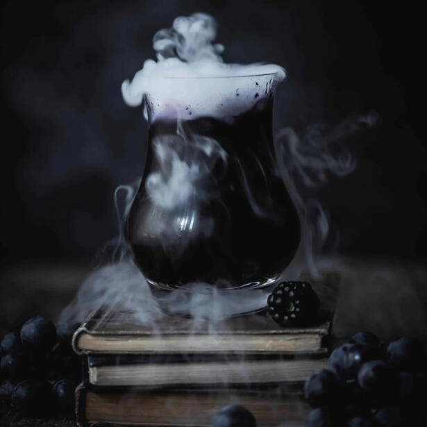 A mysterious pitch black drink with biting flavor that entices the senses with its citric tones and strong essence. The mix of aged and white rum coming from the Ciedales bathes the alchemical activated charcoal and the blackberries brought from the darkest corners of the Shroud. Would you like to consume darkness itself?
