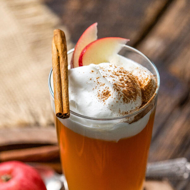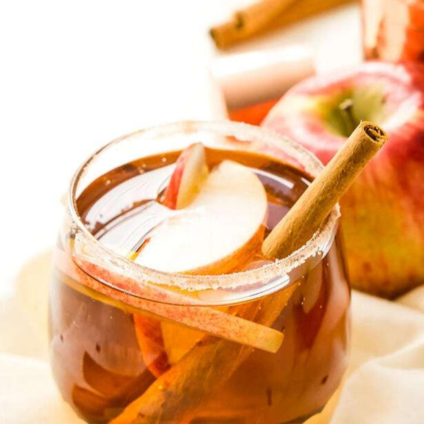 Ingredients: Rum, Apple Juice, Vanilla, Ice, Apple Slices and a cinnamon sugar rim