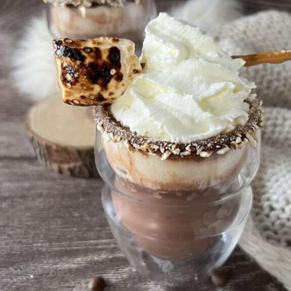 Ingredients: Dark chocolate & pretzel crumbles for the rim, fresh hot cocoa, whipped cream, and a roasted marshmallow skewered on a pretzel