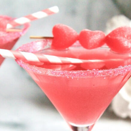 Ingredients: Sparking Strawberry watermelon water, simple syrup, three heart gummies, Pink sugar and edible glitter (Rim), Champagne is optional