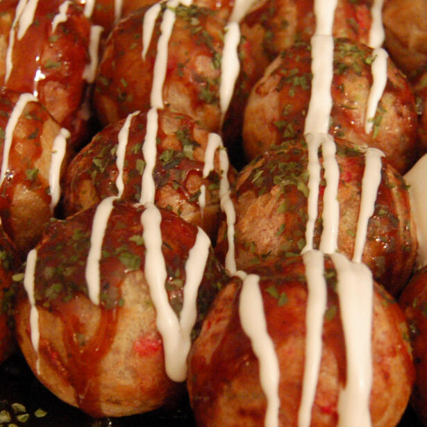 These iconic spherical snacks cooked in a cast iron pan are thickly battered with a wheat based dough, stuffed with several different savory flavors of vegetables and seafood. Upon serving they are garnished with a teriyaki sauce and Kugane Mayo. A joy to eat and play with.