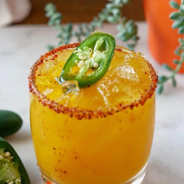Ingredients: Mezcal Anejo, Lime Juice, Ginger Syrup, Salt and Pepper Rim, Garnished with Lime