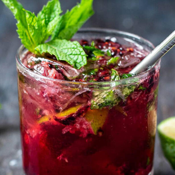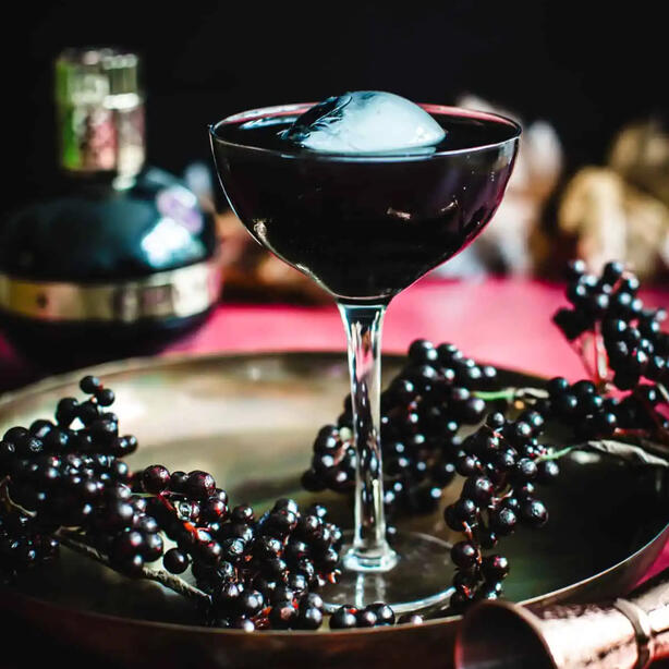 Ingredients: Activated charcoal, blackberries, grape and lime juice, white and aged rum.