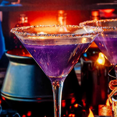 Ingredients: Ectoplasm (Luster Dust and Simple Sugar), Bottled Shadow (Lilac Gin), Bone Dust Rim (Raw Sugar Rim), Chilling grasp (Blue Curacao), Bile (Lemon Juice) and ?????