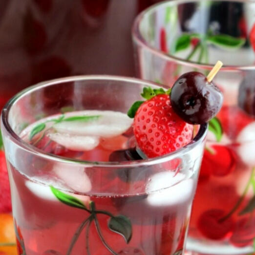 Ingredients: Cherry liqueur, white wine, soda water, garnished with pitted cherries and cut rolanberries